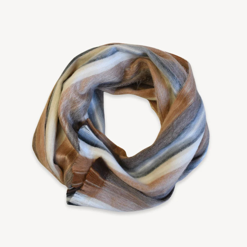 This scarf is hand-loomed, machine-woven, and then machine-brushed for added softness. This unique, artisanal scarf collection is made by a family of Indigenous artisans living in the volcanic mountains of Ecuador. The order of which the colors are woven vary from scarf to scarf, however the colors you see remain the same with each - making it a truly unique artisan gift.