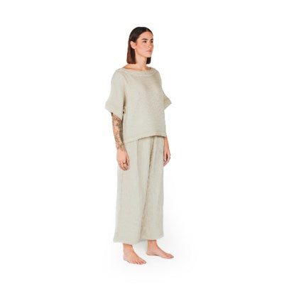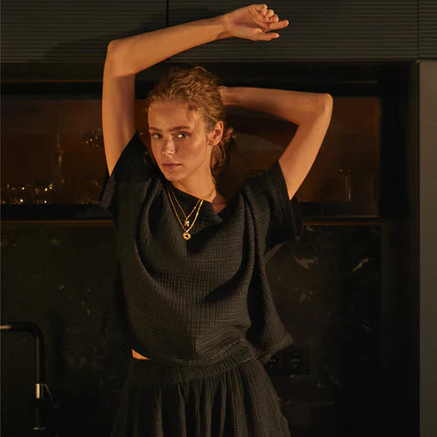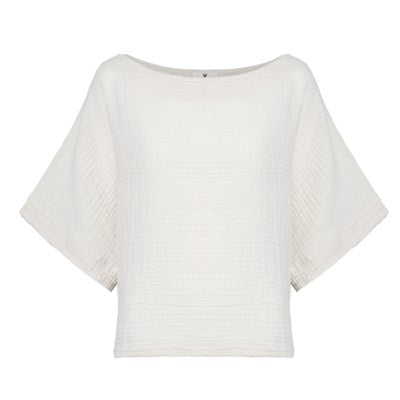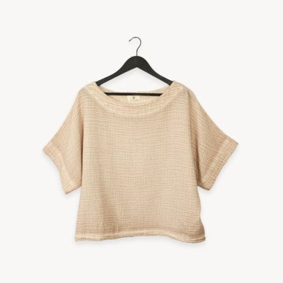 Made with a luxe fabric composed of doubled Turkish muslin cotton. The crinkle muslin texture is incredibly soft on the skin, and feels lightweight, yet substantial when worn. Designed in an oversized style, the Crinkle Crop Top has half sleeves, with a cropped cut at the waist, and a boat neckline.