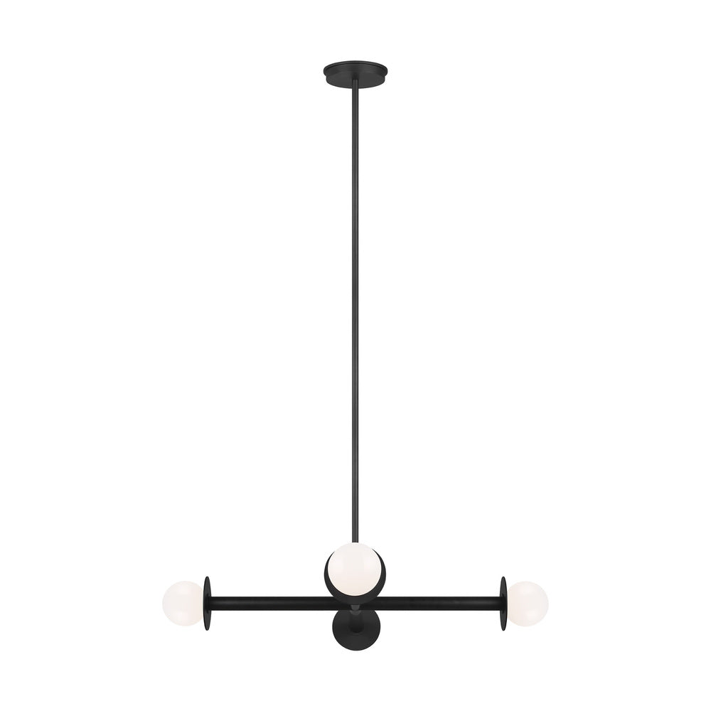 The Nodes four light single tier wide chandelier by Kelly Wearstler enhances the beauty of your home with ample light and style to match today's trends. Nodes task, ceiling and wall lighting is minimal yet bold, highlighting Kelly's distinctive juxtaposition of mixed-materiality and curvilinear form. Light radiates from milk glass globes set against metal discs. All fixtures can be used or without the discs. The cast canopy is available in Burnished Brass or Midnight Black. Hanging fixtures within this family feature black fabric cords, while pivot sconces can be cord and plug or hard wire.