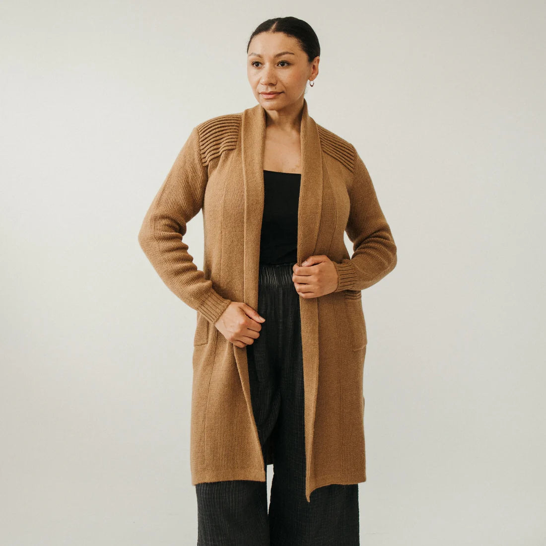 With deep open pockets, pleated shoulders, and a fit that feels cozy and comfortable. Alpaca has a stretchy, silky nature to it, so this one-size alpaca style is able to fit many different types of bodies. We’ve gone hip-length to cover the backside, this doubles as a Fall, transition coat, and a year-round sweater.