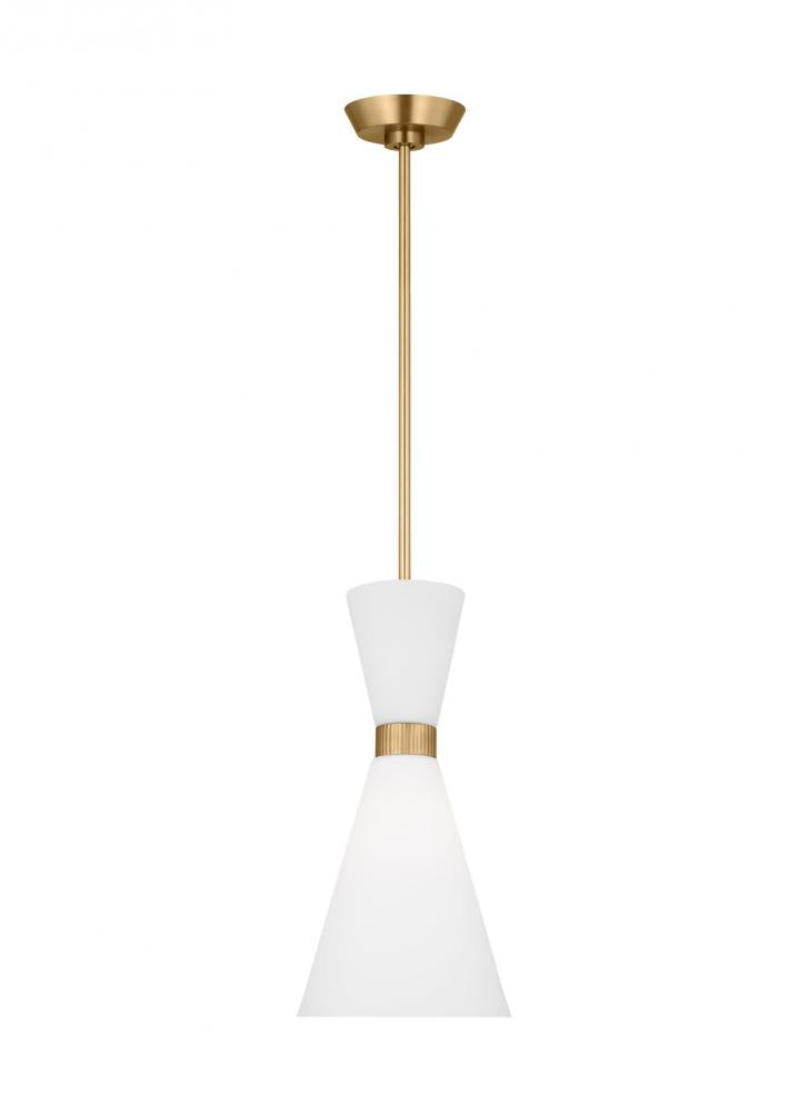 Inspired by playful mid-century modern design, the Drew & Jonathan Belcarra Small Pendant is accentuated by a flared glass shade with ribbed metal details and etched white glass that bestows an almost whimsical touch to the clean design. Available in three finishes, Brushed Steel, Midnight Black, and Satin Brass, the Belcarra looks great on its own or when grouped in multiples. This product may be mounted on a sloped ceiling and is cETLlistedfordamp locations, making it the perfect lighting solution for any space.