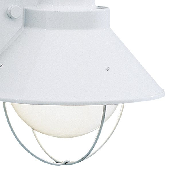 The 1 light outdoor Seaside wall light in White finish uses 100 watt (max.) bulb equivalent, measures 8" in width with a body height of 12". It is damp rated and dark sky compliant.