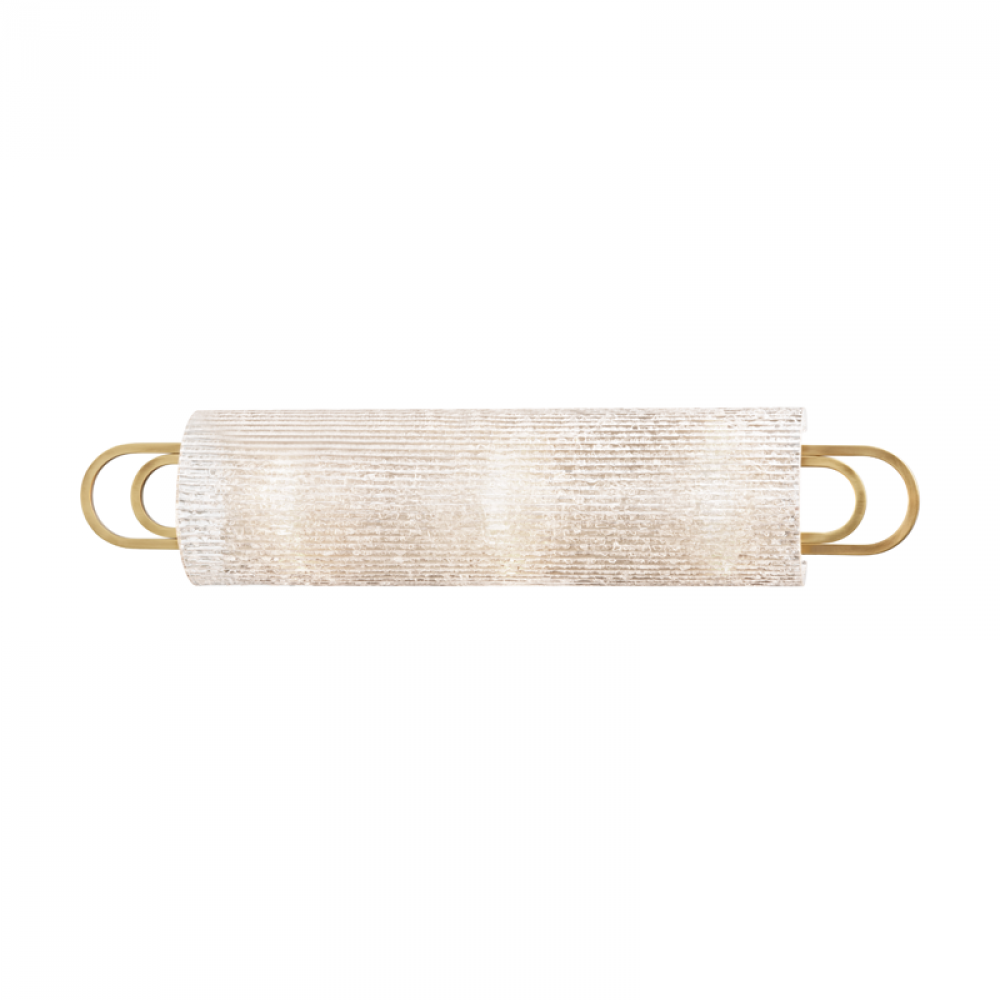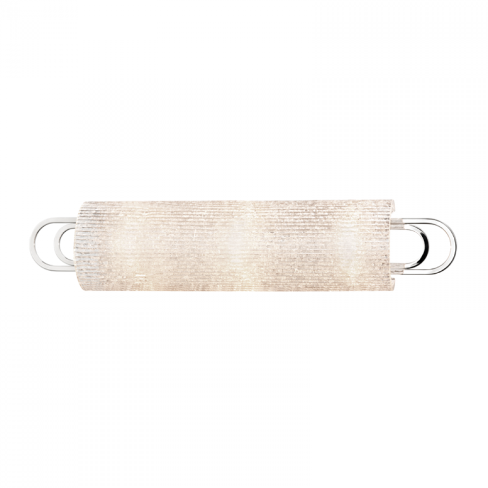 The handmade glass that artfully distorts the light in our Buckley family is unique. Clean, ribbed glass faces inward from the ovalesque piece. Broken chips of glass have been fused onto the back, causing a refractory effect. A double band of thick square metal mounts the fixture.