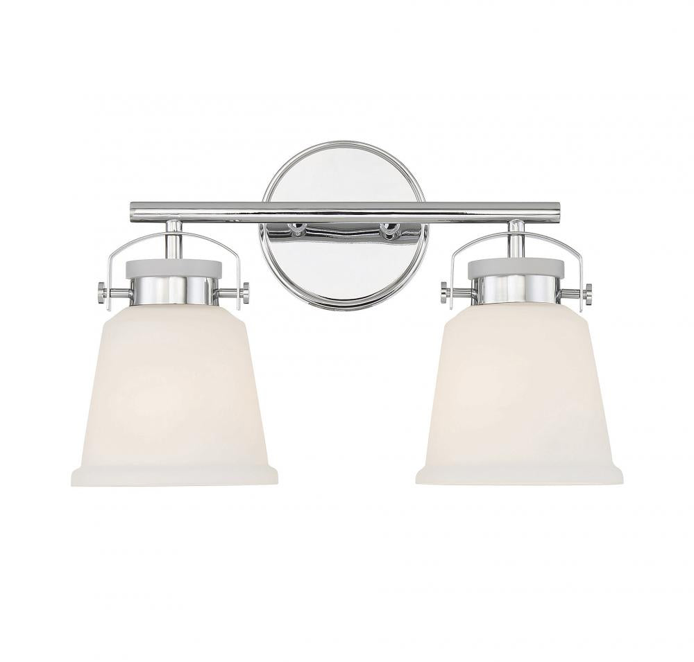 The Kaden 2-light bathroom vanity light from Savoy House has a classic look with a hint of industrial inspiration. White opal glass shades are held in place with eye-catching hardware that, like the bar and backplate, is finished in matte black. Kaden is 10.5" in height, 16" in width and extends 7" from the wall. It uses two standard size bulbs with a max of 60 watts per bulb. Damp area rated.