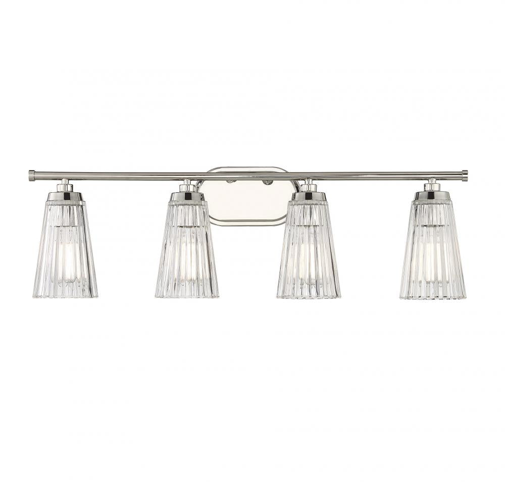 Textured, eye-catching shades of clear ribbed glass take center stage in the Chantilly 4-light bathroom vanity light from Savoy House. Finished in matte black. Chantilly is 10" in height and 30.5" in width. It extends 7" from the wall. Uses four standard size bulbs of up to 60 watts per bulb. Damp area rated.