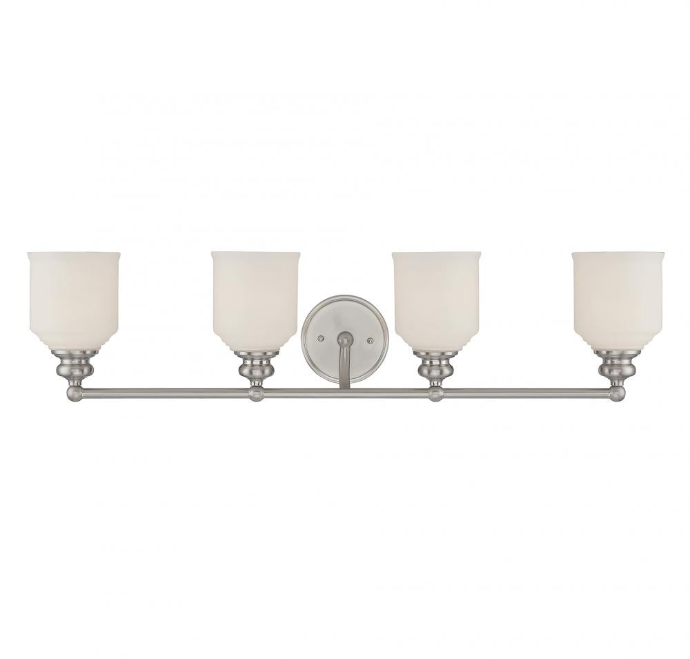 From Savoy House, the Melrose 4-light bath vanity bar stylishly updates classic Americana design for today's interiors. It features modern lines, white opal glass shades and an English bronze finish. It may be mounted as either uplight or downlight. Bath bar lights are a classic choice for illuminating vanity mirrors in bathrooms big and small. The English bronze finish can be paired with bronze hardware or mixed with hardware in other finishes. Bring Melrose into bathrooms of traditional, transitional or classic style to improve the look and the lighting. When you choose a Savoy House lighting fixture, you can be certain youve selected a piece that will withstand the test of time.