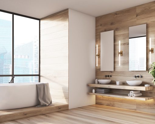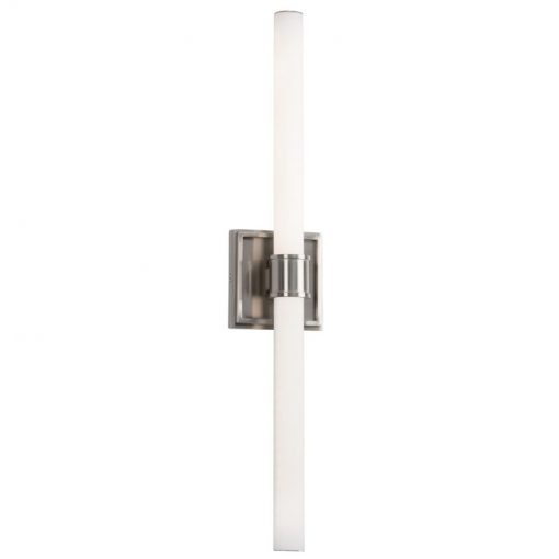 A tubular length of illuminated rod the Rona wall light is supported and clasped with a detailed cylindrical projection. The thick square outline of the attachment plate frames the lamp holder and echoes the refinement of present architectural trim. Available as either a sconce or vanity and in several curated finishes.