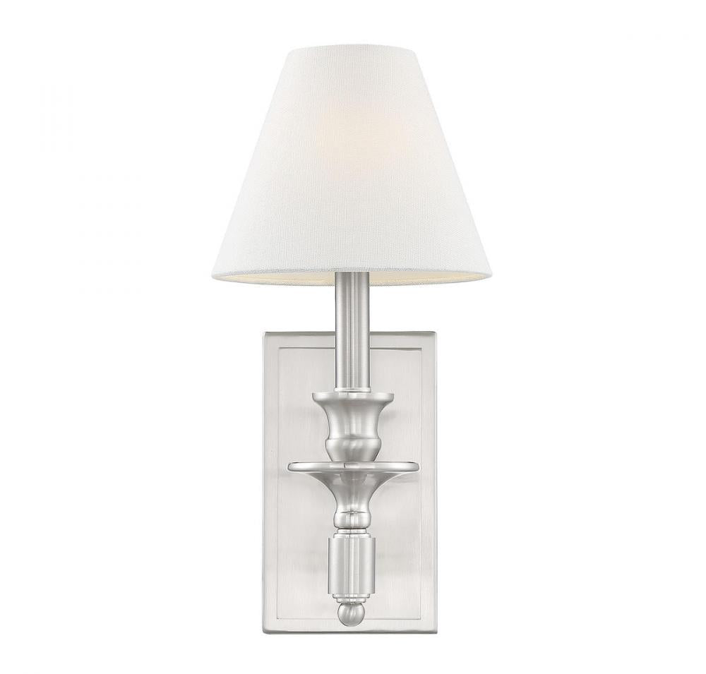 Add an elegant touch to your walls with this Savoy House Washburn 1-light sconce. It has a traditionally-inspired look with clean lines and thoughtful touches. Features a white linen shade and polished nickel finish. Sconces add a touch of style and light to any wall, including but certainly not limited to hallways, entryways, stairways, great rooms and dining rooms. You will also often see a pair of sconces flanking a bathroom vanity mirror to provide an even, flattering wash of light. Bulb not included. The polished nickel finish can be paired with nickel hardware or mixed with hardware in other fixtures. Washburn is perfect for traditional style rooms, but also terrific for transitional style and other styles too! When you choose a Savoy House lighting fixture, you can be certain youve selected a piece that will withstand the test of time.