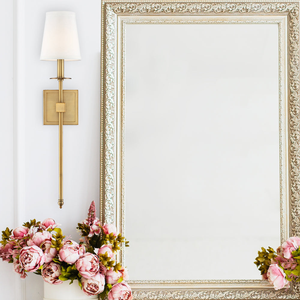This Savoy House Monroe 1-light sconce features a long sleek body, a white fabric shade and a classy, contemporary silhouette. Classic bronze finish. Sconces add a touch of style and light to any wall, including but certainly not limited to hallways, entryways, stairways, great rooms and dining rooms. You will also often see a pair of sconces flanking a bathroom vanity mirror to provide an even, flattering wash of light. Bulb not included. The classic bronze finish can be paired with bronze hardware or mixed with hardware in other finishes. Monroe is a perfect addition to rooms of any style, especially transitional or classic. When you choose a Savoy House lighting fixture, you can be certain you, e selected a piece that will withstand the test of time.