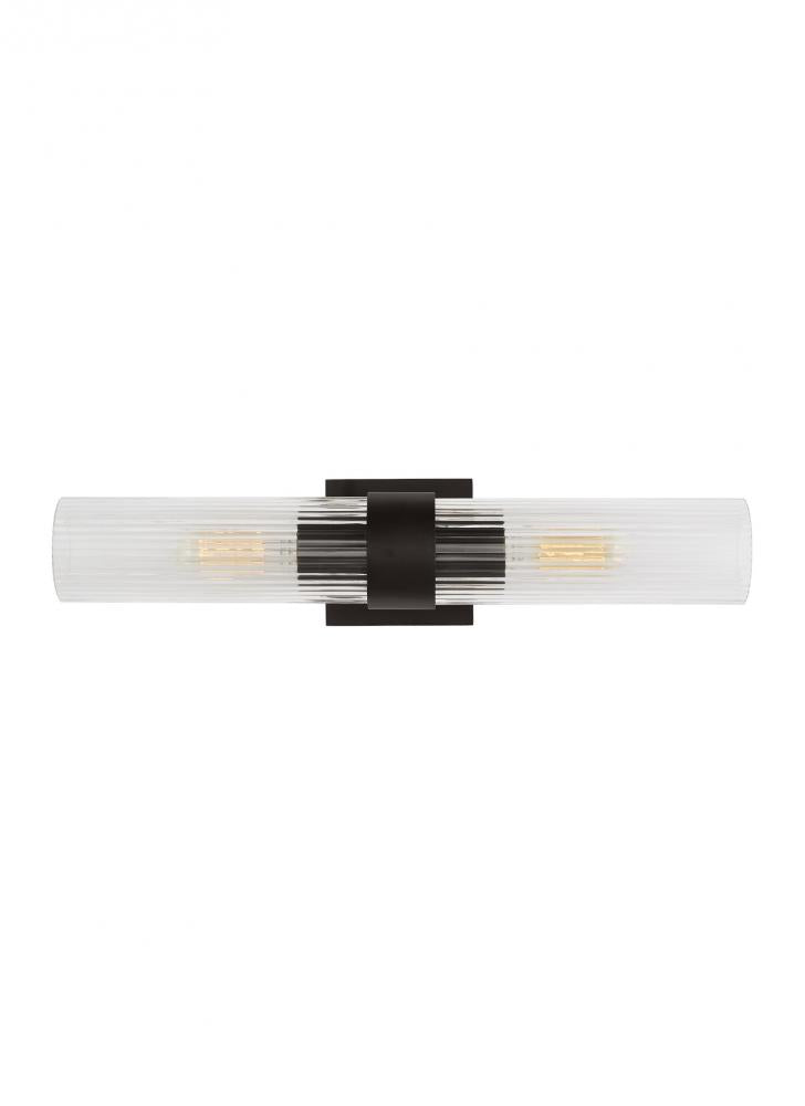 In the Geneva two light vanity fixture, slender, fluted shades form an elegant, dynamic silhouette that's balanced by a strong frame of Burnished Brass or Polished Nickel.