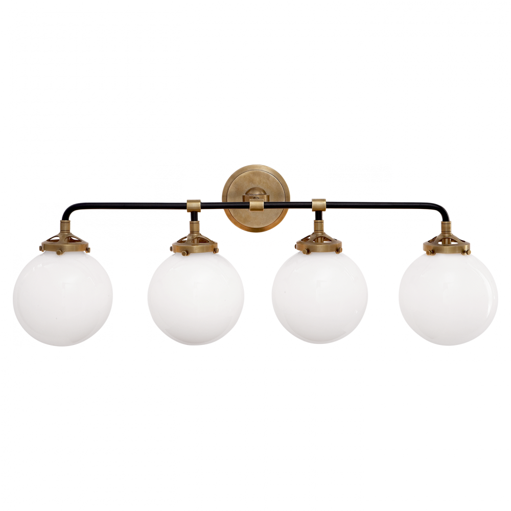 Bistro Four Light Bath Sconce in Hand-Rubbed Antique Brass and Black with White Glass