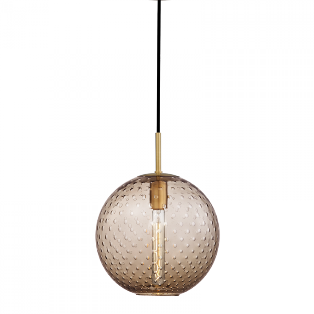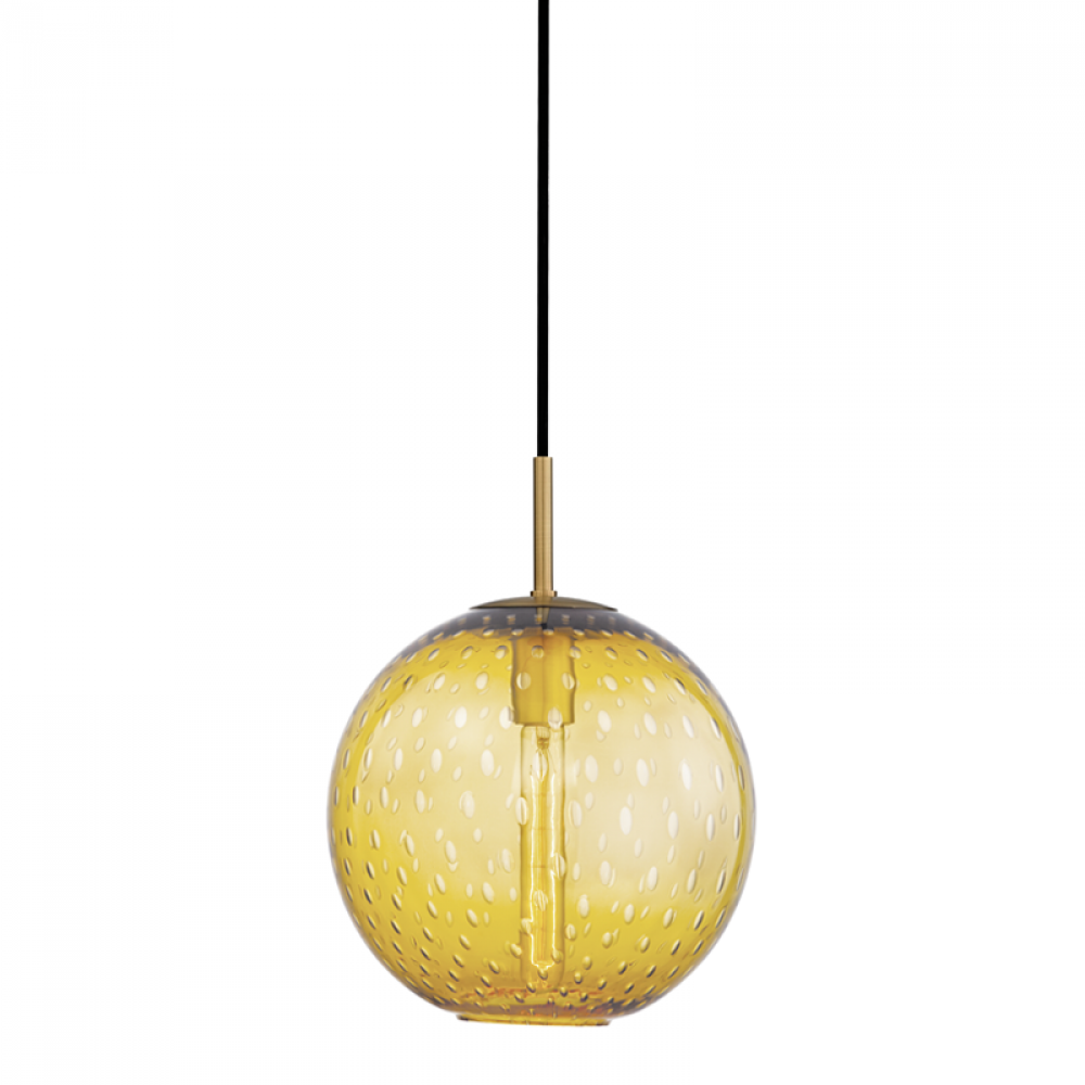 Thick mouth-blown glass with a discrete pattern of bubbles domes around a warm incandescent bulb. At its base, the globe has an opening, which allows you to manually change the bulb. Smooth woven cords add an urbane touch. Exciting options in our Rousseau family include several fun colors and the choice between hanging a single pendant or a staggered cluster.