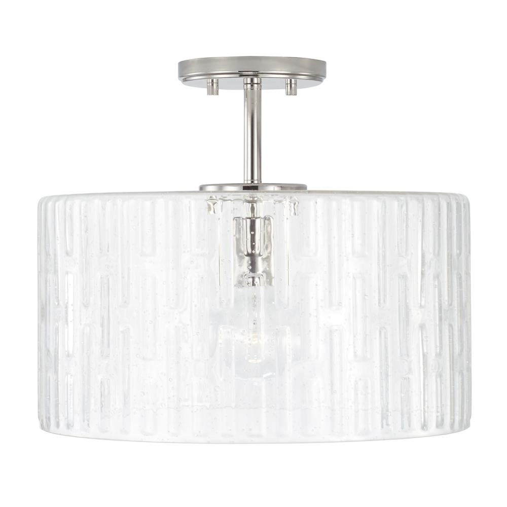 Create a simple and striking statement with the Emerson 1-Light Dual Mount Pendant. This fixture features a wide seeded glass shade with an embossed geometric pattern that sparkles on a clean and classic Aged Brass frame. This fixture can be used as a Semi-Flush or as a Pendant.