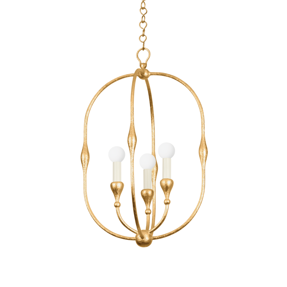 Rooted in French design aesthetics, this chandelier features an oval hanging frame with three or four candle lights, radiating a warm and inviting glow from within. A blend between a lantern and a globe, this design reinterprets a classic silhouette to align with modern preferences for open and airy fixtures. Baltic is available in two sizes and two finishes; Vintage Gold Leaf or Aged Iron.