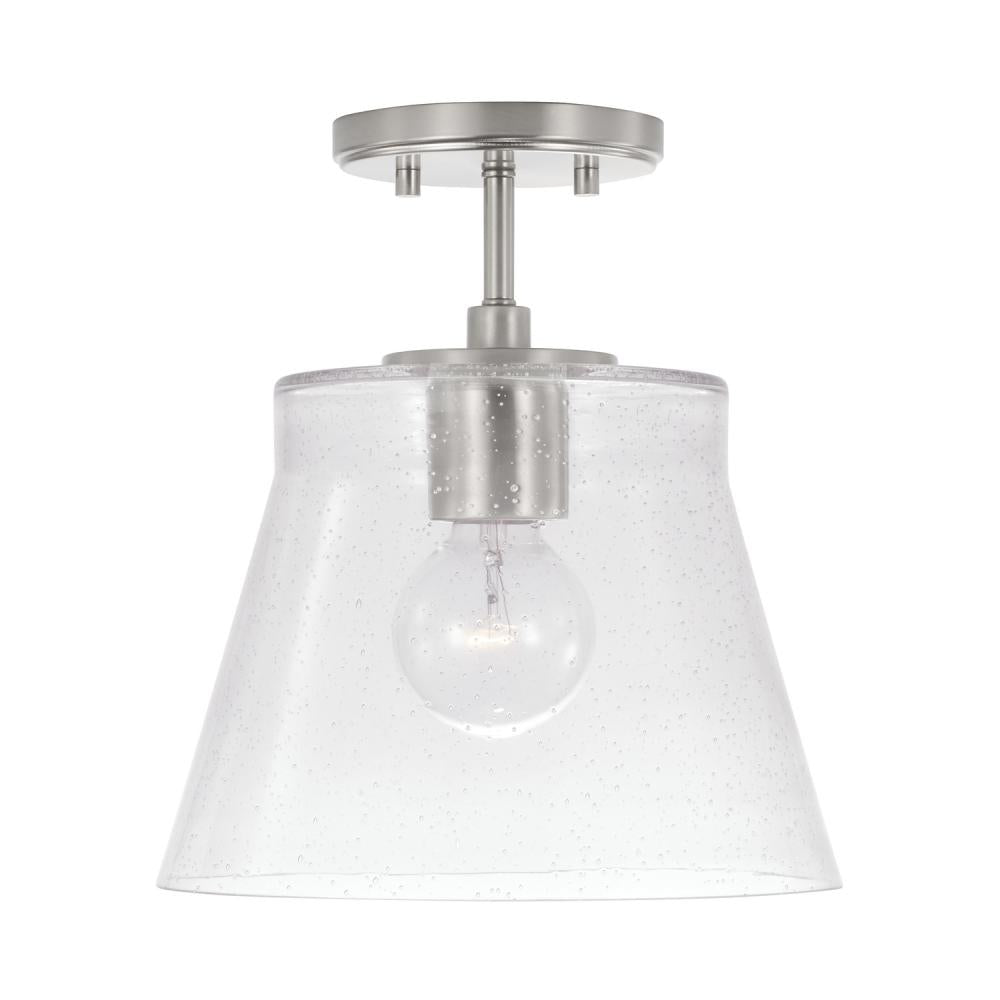 Simple and sleek, the Baker Small Pendant for Homeplace brings standout style to signature pieces. Whether hung as a pendant or semi-flush, the Aged Brass finish beautifully accents the tapered seeded glass for versatility and sophistication.