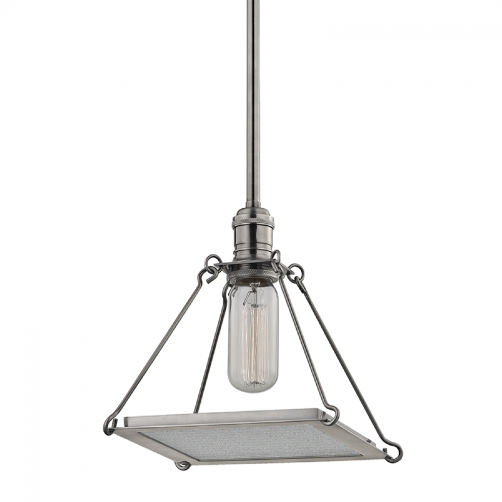 In Thorndike, we take an exposed-filament bulb, suspended in a handsomely detailed candlecup and, using four simple metal holders, diffuse the light through a square piece of safety glass. Smooth on one side and stippled on the other, this glass is enmeshed with hammered wire and held in a Spartan brass frame.