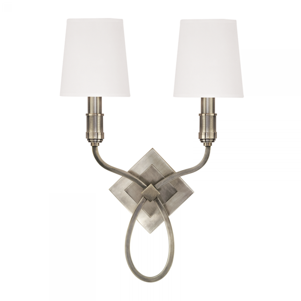 Two become one in the intertwining loop of our Westbury wall sconce. Twisting metal stems form an unbroken union between the pair of shaded candlesticks. Westburys diamond-shaped backplate anchors the flowing forms, while providing angular contrast to their whimsical shape.