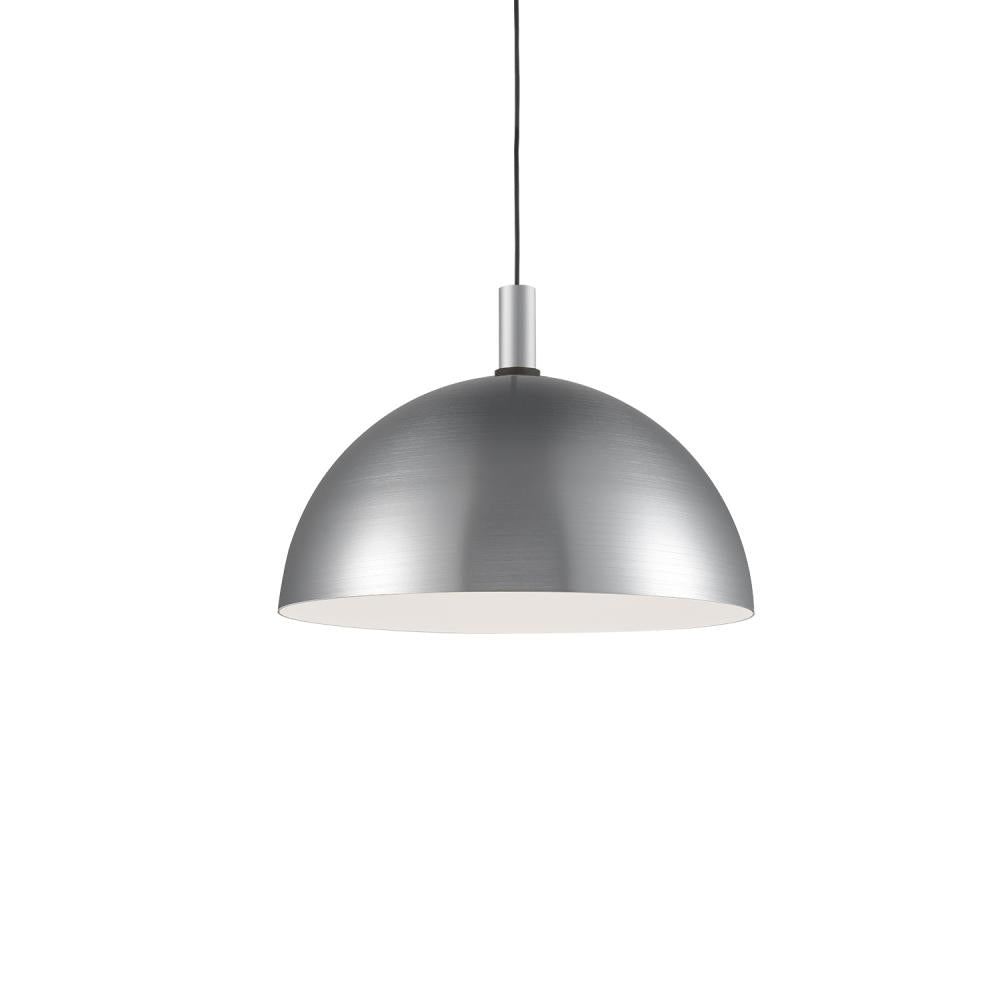 Single-lamp pendant with aluminum dome shade showcasing powder-coated or plated finishes with metal details and a matte white interior. Exterior shade colors are black, brushed nickel, or white. Suspended by cloth cable. Available in three sizes.