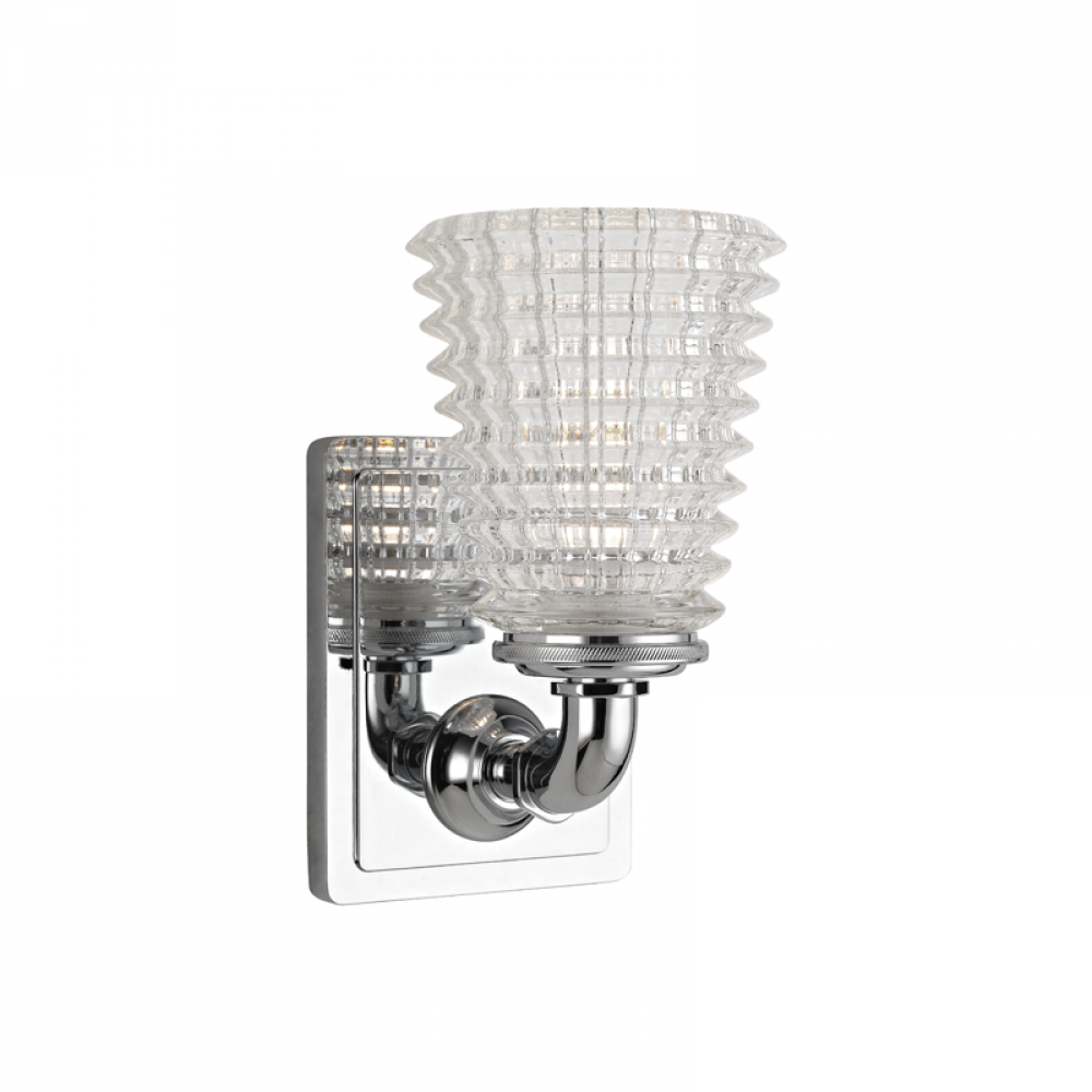 Prismatic glass shades lend this piece a nostalgic charm, while contrasting with the smooth planes of arm and backplate for the tension that is the watermark of good design. The arms, inspired by fine plumbing fittings, help to exude a glamorous air to an otherwise utilitarian piece.