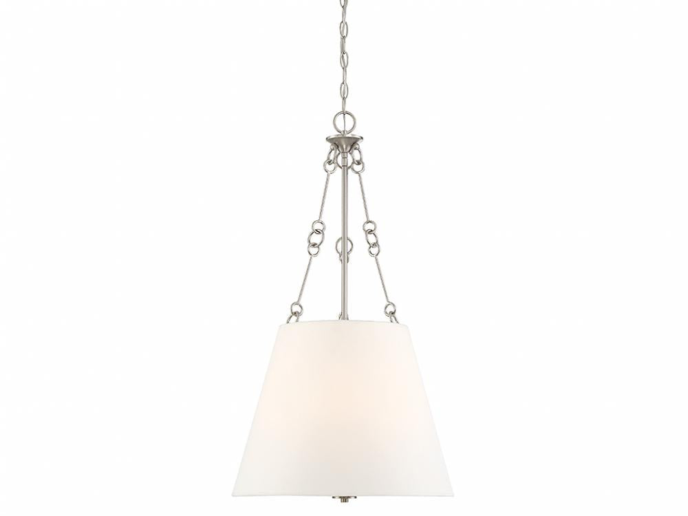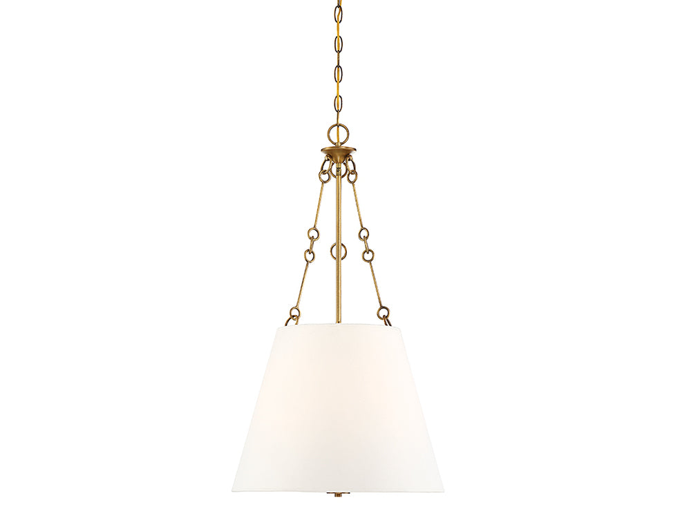 This Savoy House Austin 4-light pendant has a crisp and transitional style with a large white fabric shade that obscures the light sources, creating a soft and comfortable glow. English bronze finish. Pendants are extremely versatile and can fit in many different spaces, such as kitchens, family rooms, great rooms, foyers, entryways, offices, bedrooms and bathrooms. Because this pendant is chain-hung, you can use as much or as little chain as you need to fit your specific hanging height needs, and this pendant can be used on a sloped ceiling. Bulb not included. You can pair Austin with hardware finished in bronze or mix it with hardware in other finishes. Its subtle elegance means it is a perfect choice for rooms of any decor style. When you choose a Savoy House lighting fixture, you can be certain you've selected a piece that will withstand the test of time.