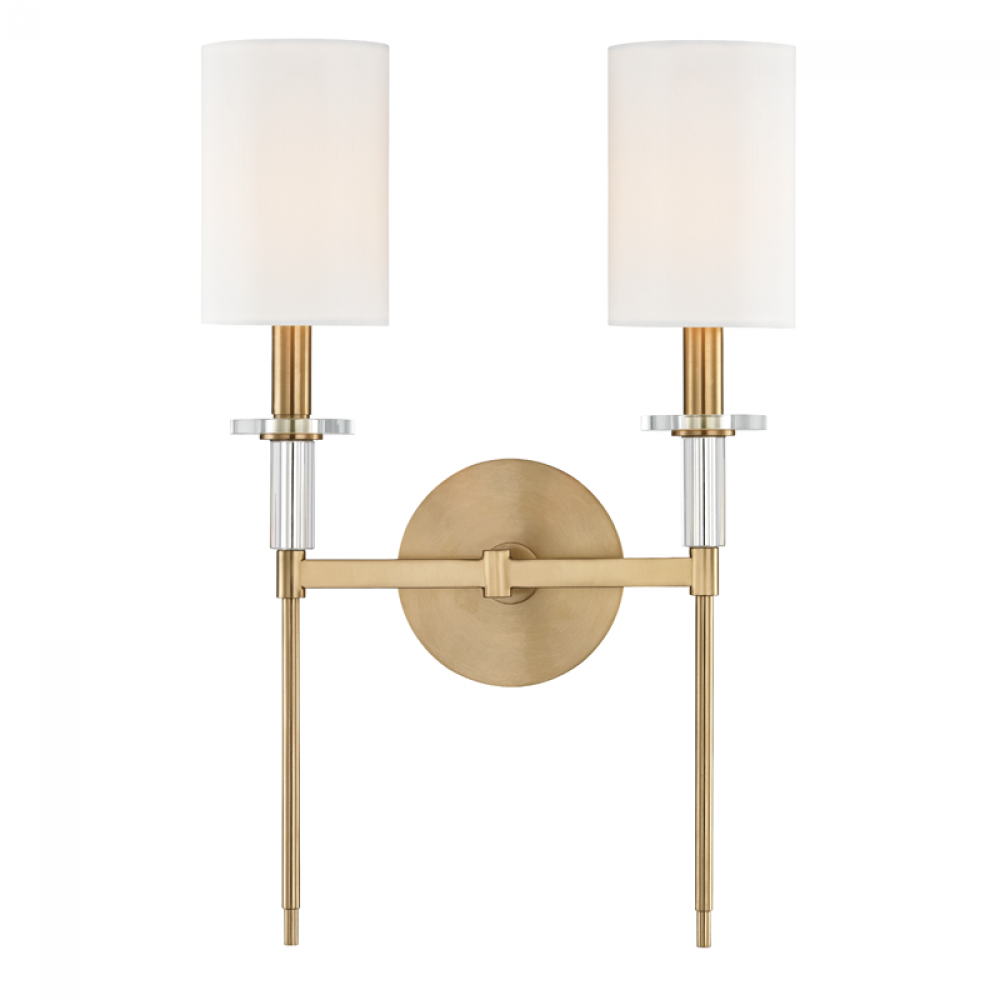 The elongated torch handles of our Amherst family shun needless complexity, resulting in smooth sophistication. Crystal accents give it a 21st-century twist. White fabric shades top the tall tapers, complementing the cylindrical shape of Amhersts crystal bobeches.