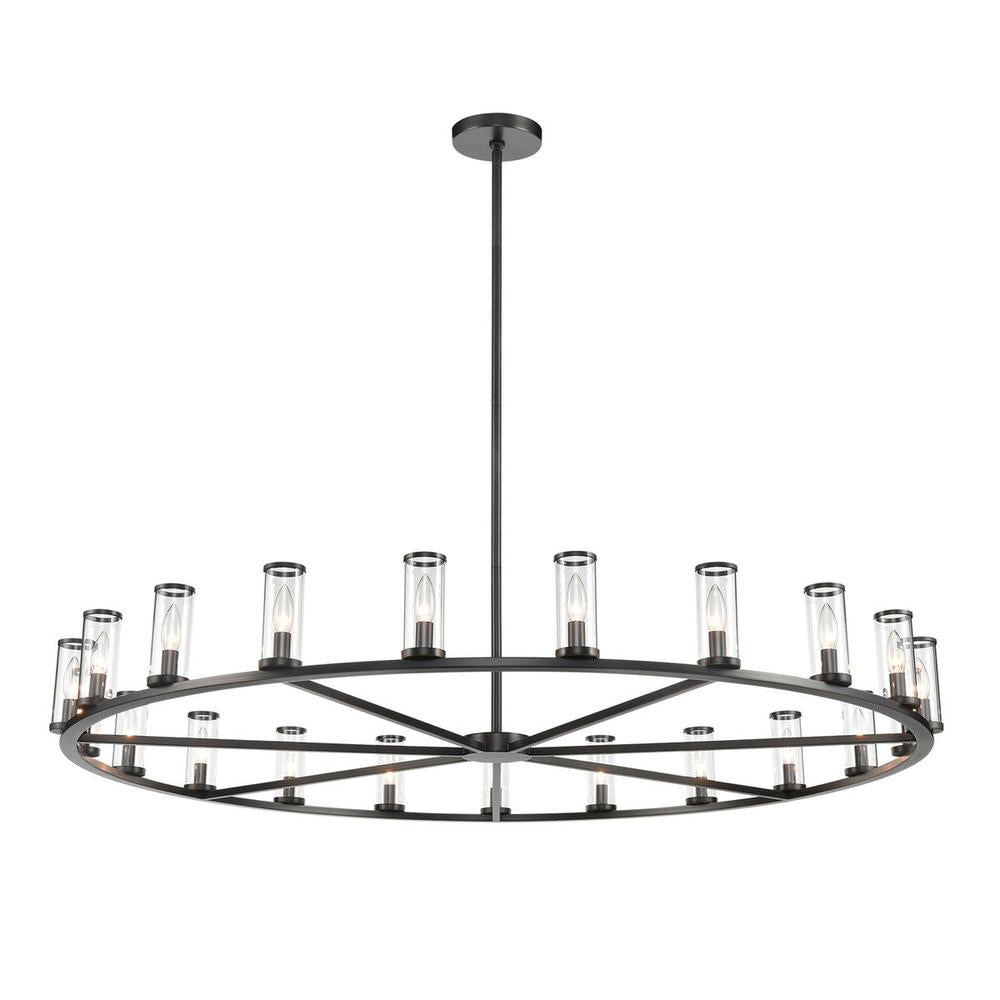 Evoking the elegance of antique candle-holders, Revolve has clear glass tubes accented with metal rings, gathered around a striking chandelier body. Available in multiple finishes, also available as a series of coordinating vanity and wall sconces.