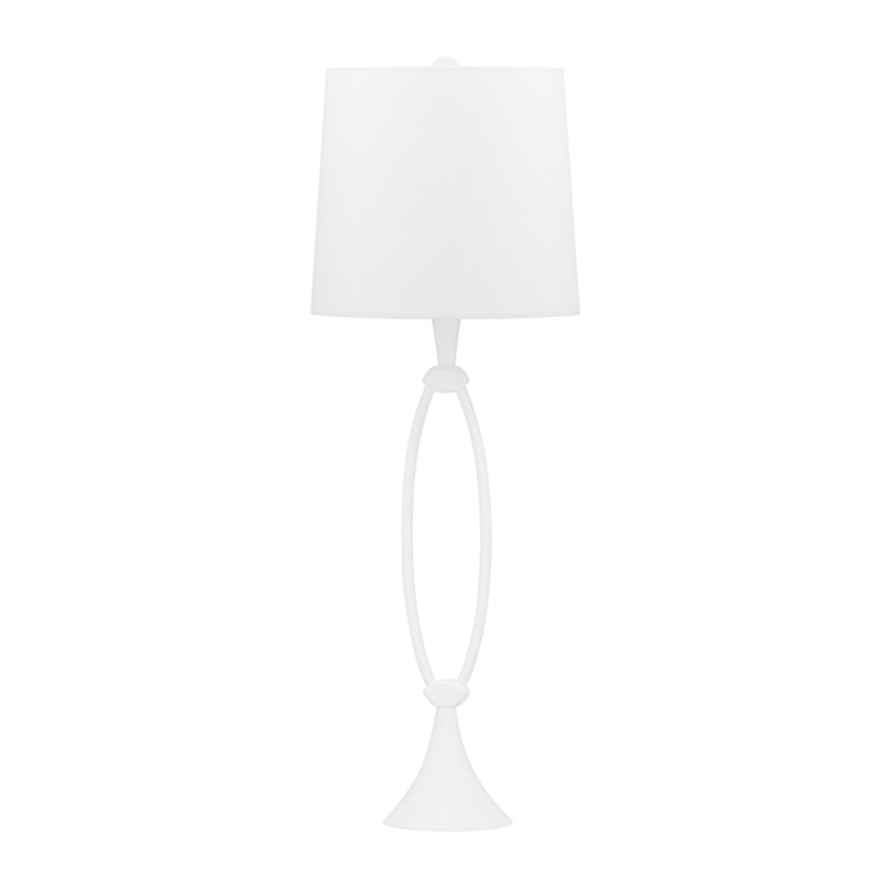 Conklin's smooth, modern base and traditional drum shade are perfectly pulled together by an airy, curved body that complements them both. Soft light emits from the Belgian linen shade and a hint of metal peeks through the finial at the top. Available as a table or floor lamp in two highly-textured finishes: White Plaster or Aged Iron/Black Iron.
